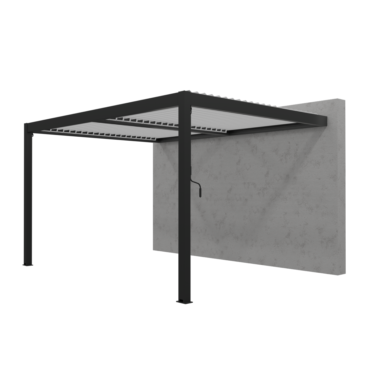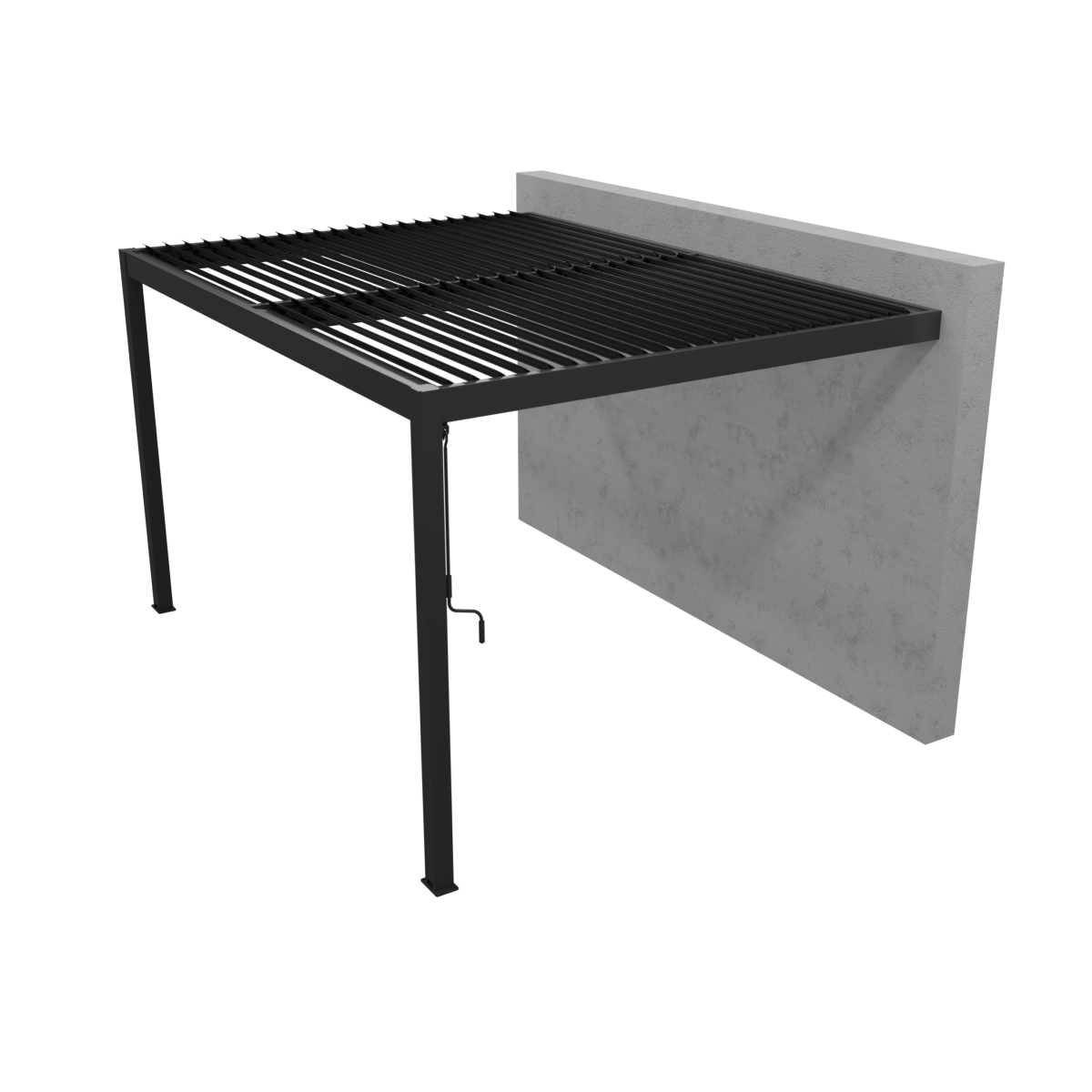 La structure de cette pergola bioclimatique Port Pin est disponible en version autoportante (4 poteaux) ou adossée avec un système de fixation au mur (2 poteaux) dans les dimensions suivantes: