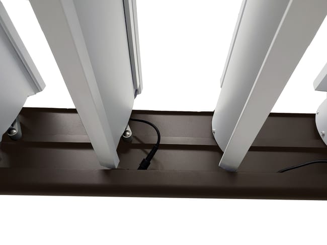 Pergola Bioclimatique aluminium autoportante Ménéa 15m² : dim :5.04×3.09m. Pergola motorisée avec lames doubles en aluminium orientables : la manipulation des lames et l’éclairage LED intégré sont pilotés par interrupteur sur le poteau et par télécommande fournie. Facile à monter, au design contemporain, profitez de bons moments confortablement installés sous votre pergola Green Outside. Structure coloris noir RAL2100, lames blanches RAL9016. Évacuation des eaux de pluie dans les poteaux. Demandez conseil en magasin pour les accessoires disponibles (rideaux, panneaux BSO à persiennes aluminium orientables…) A monter soi-même.