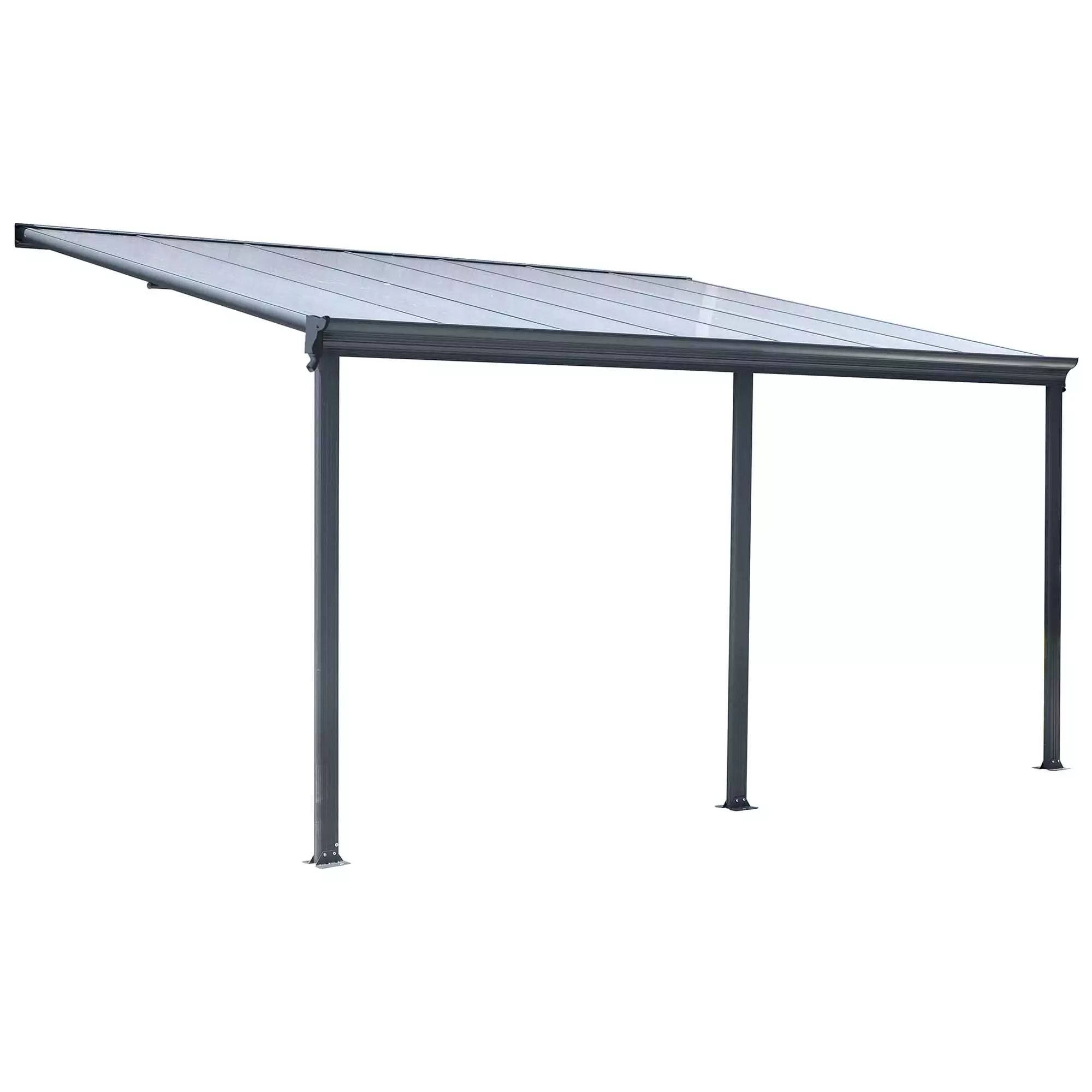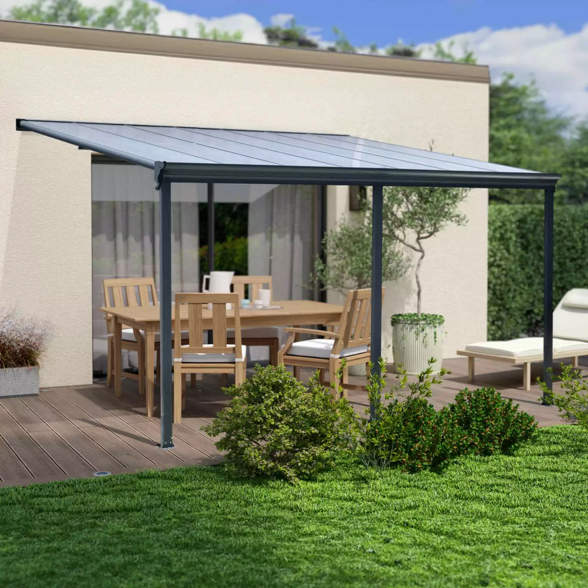 Le toit en polycarbonate gris transparent de 6 mm, résistant aux UV, permet une transmission optimale de la lumière tout en offrant une protection fiable contre le soleil et également contre la pluie grâce à son toit monopente. L’adossement au mur de la façade de votre maison optimise l’utilisation de l’espace. La fixation de cette pergola est simplifiée grâce à trois blocs bétonnés, avec des accessoires d’ancrage inclus. En bonus, elle peut par ailleurs être utilisée comme carport pour protéger votre véhicule des intempéries, ajoutant une polyvalence pratique à son design.