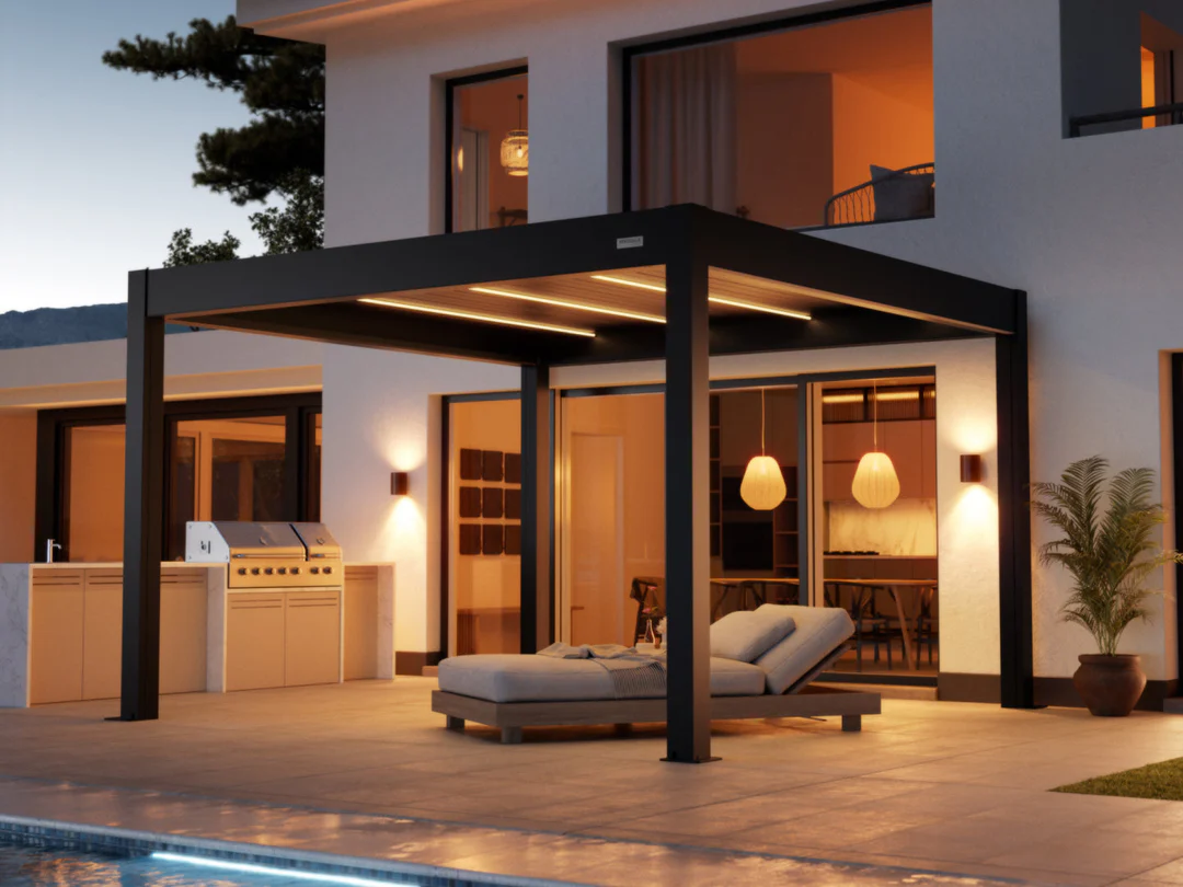 - Éclairage LED Intégré aux Lames Un éclairage parfait. Des LED subtiles intégrées dans les lames du toit créent l’atmosphère idéale pour les soirées et nuits.