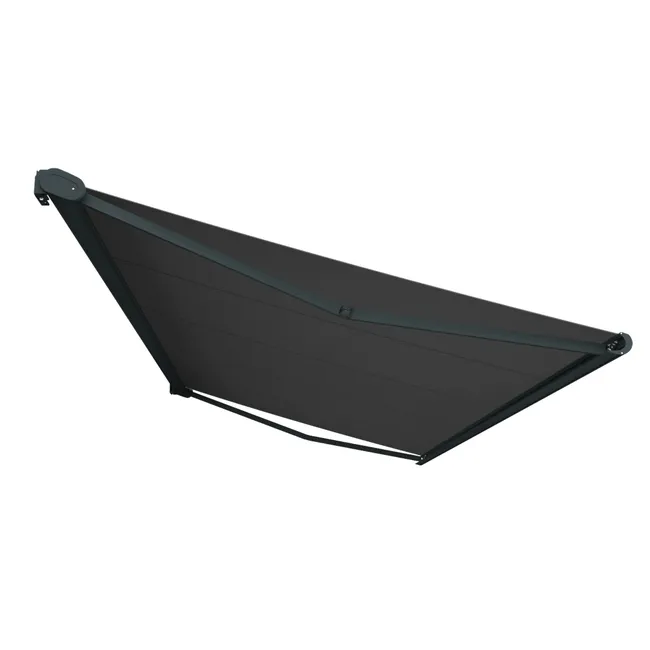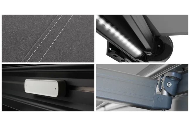 Structure en aluminium extrudé thermolaqué gris anthracite structuré. Tube d’enroulement en acier galvanisé de diamètre 78mm. Bras en aluminium avec double câble en acier inoxydable, protégé par une gaine isolante. Testé plus de 10000 cycles (1 cycle = 1 ouverture et 1 fermeture).