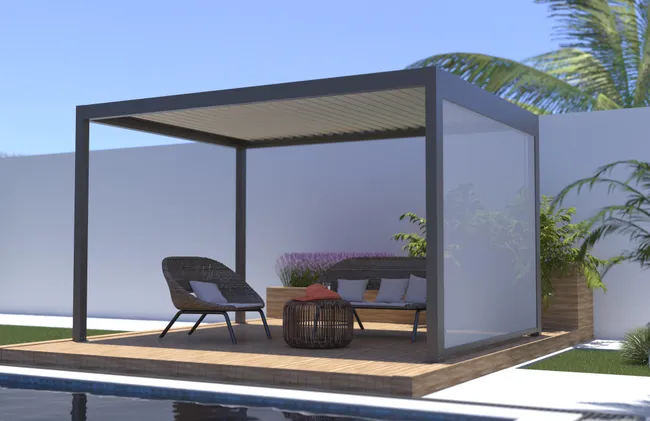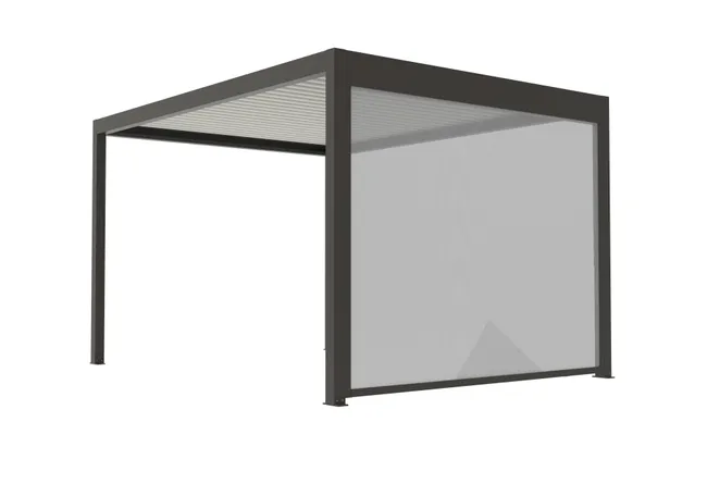 store latéral guidé sur les côtés pour pergola Caleta autoportante gris taupe 7039 sablé, toile gris clair. Manivelle fournie